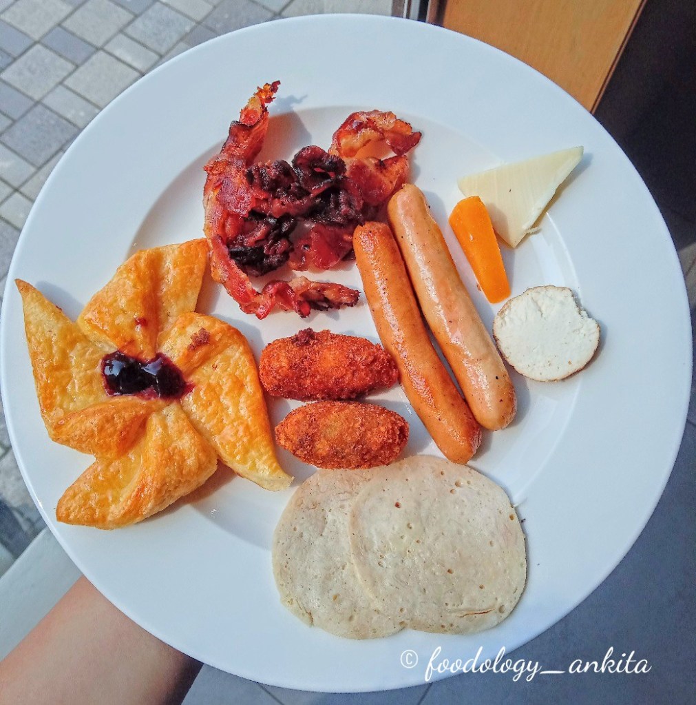 Brunch: I had a plate full of vibrant colours. There were – Fried eggs, Sausages, Bacons, Salami, Mini Dosa, Idli, Puri Sabzi, Breads, Different Kinds of Cheese, Salads, Fruits, Coffee, Tea, Juices, Cereals Milk, Cakes etc.